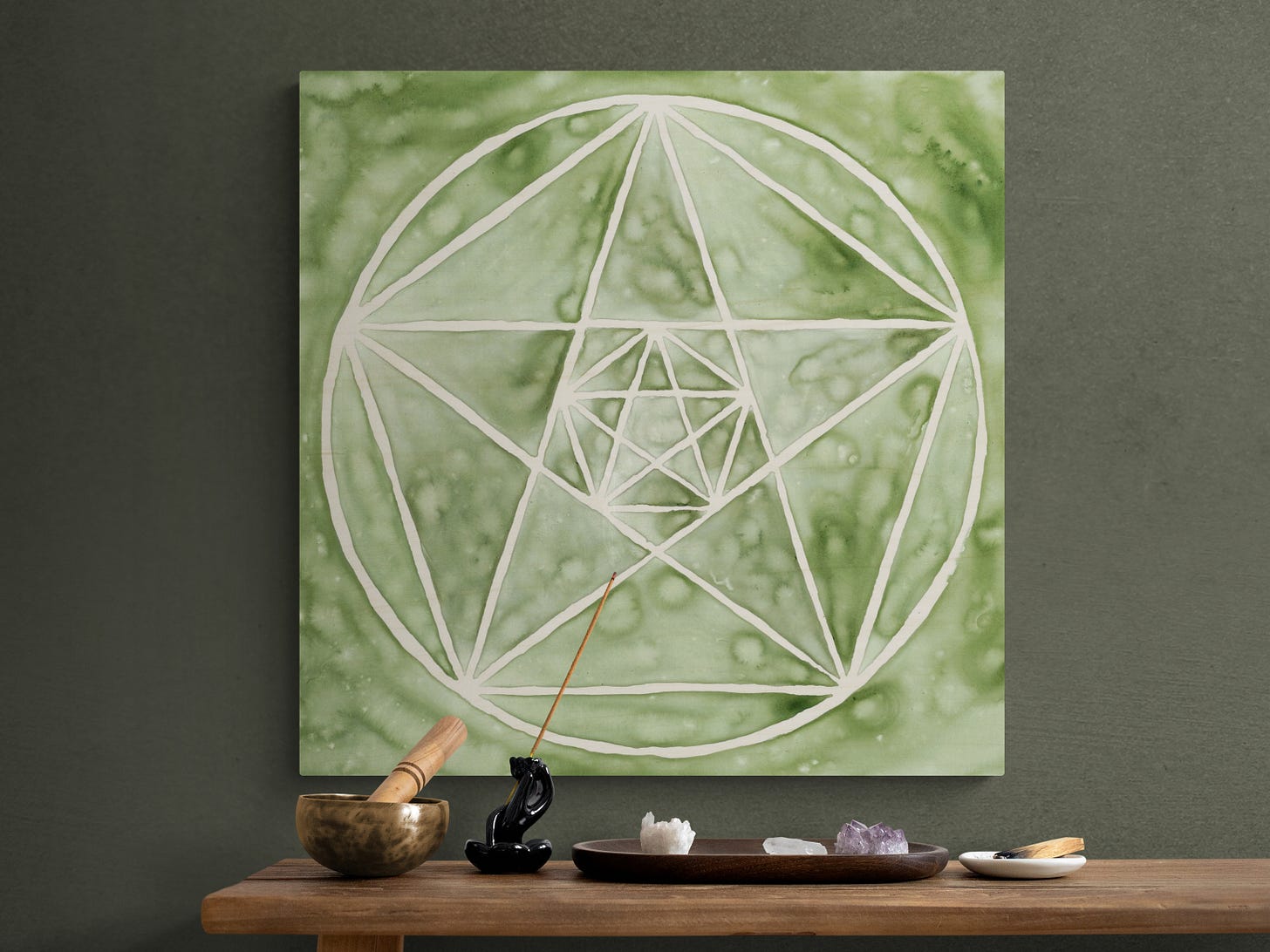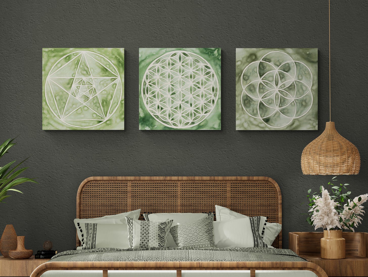 Sometimes when I go into a project, I go into problem-solving work mode, and I don't really react personally to what I'm making, until it's completely done. I work to solve that particular problem only and make design choices that I think best fit the brief. And the self-imposed brief for this one was to create a sage green mandala, either a set or a long horizontal piece, that would look good in homes where the main colour is cream and beige.
